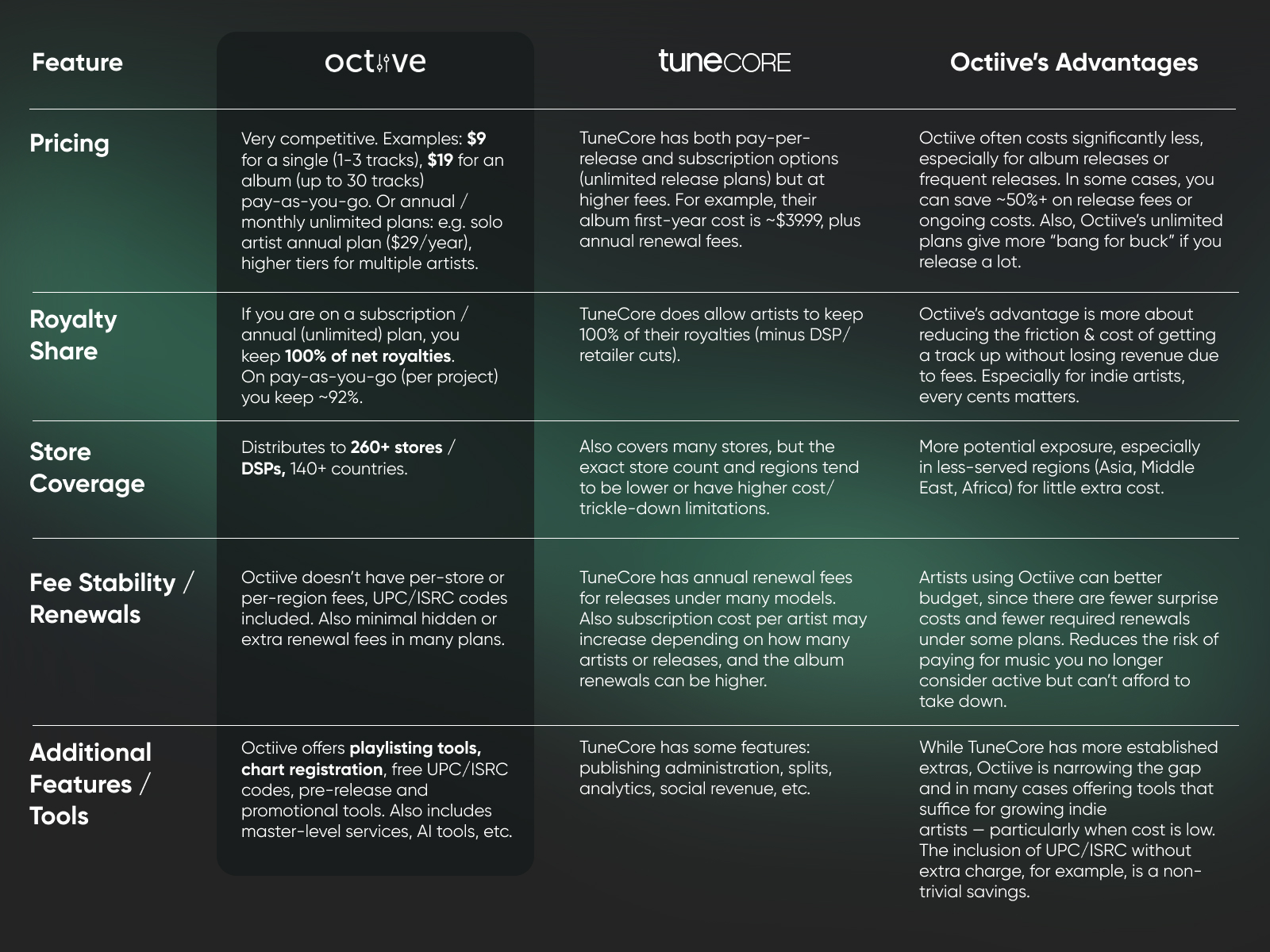260+ stores and many regions may mean more listeners in markets that TuneCore charges more to reach (or doesn’t reach as well) — so Octiive adds potential audience exposure for less extra cost.